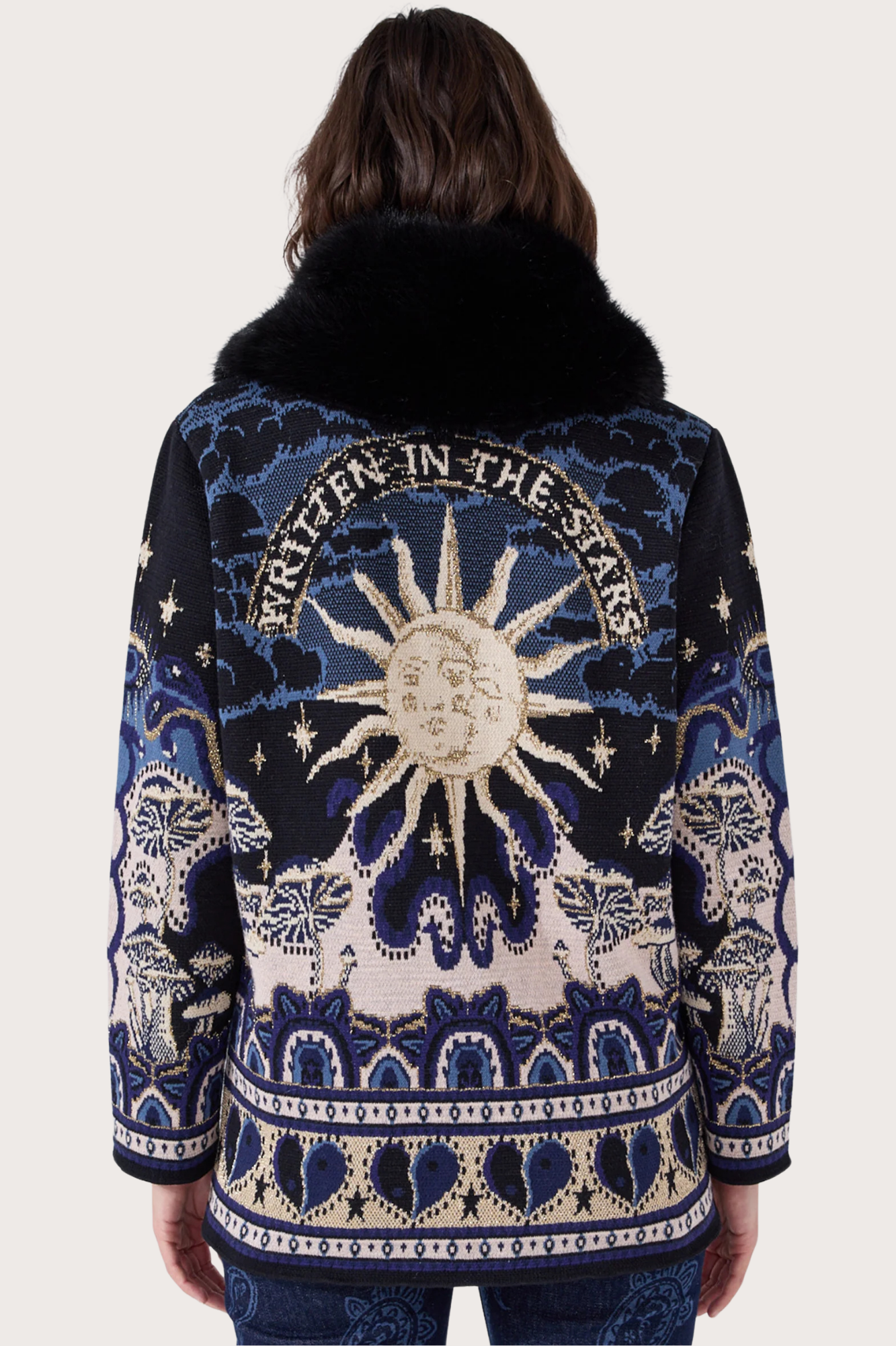 Inspired by travel and the magic of the unknown, this black celestial print knitted jacket is the ultimate high-impact layer. Crafted with a plush faux shearling collar and finished with our Written in the Stars print, its magical motifs - from eyes and hands to stars and florals - look great with a t-shirt and jeans.