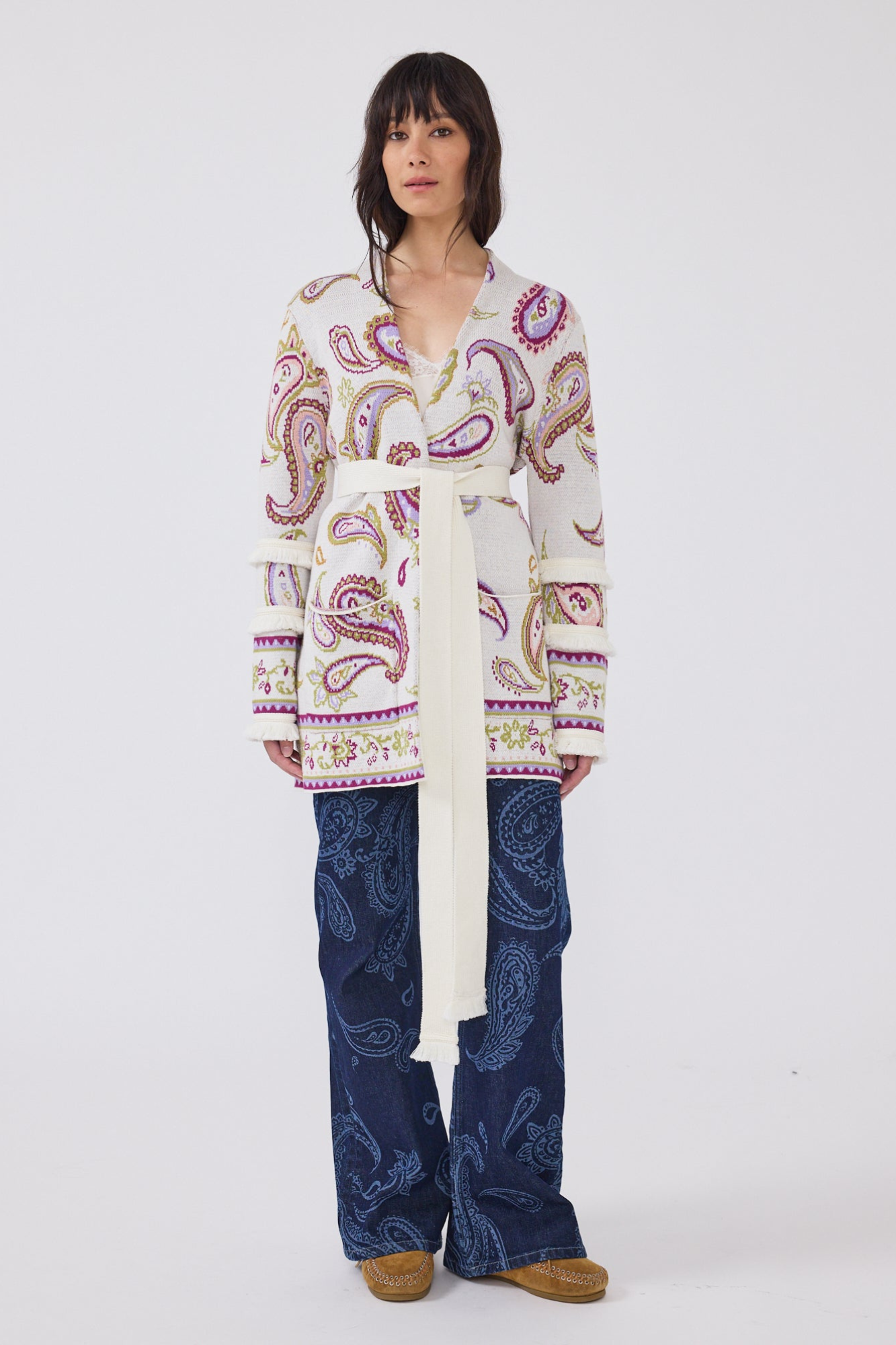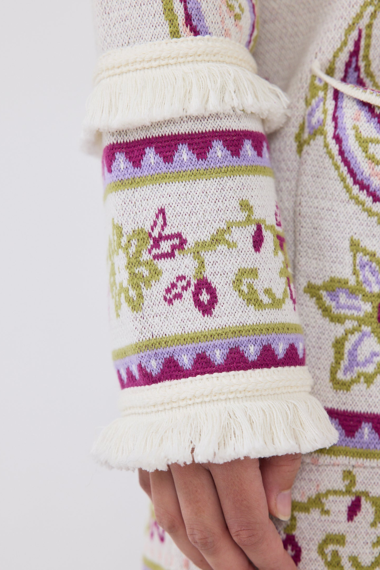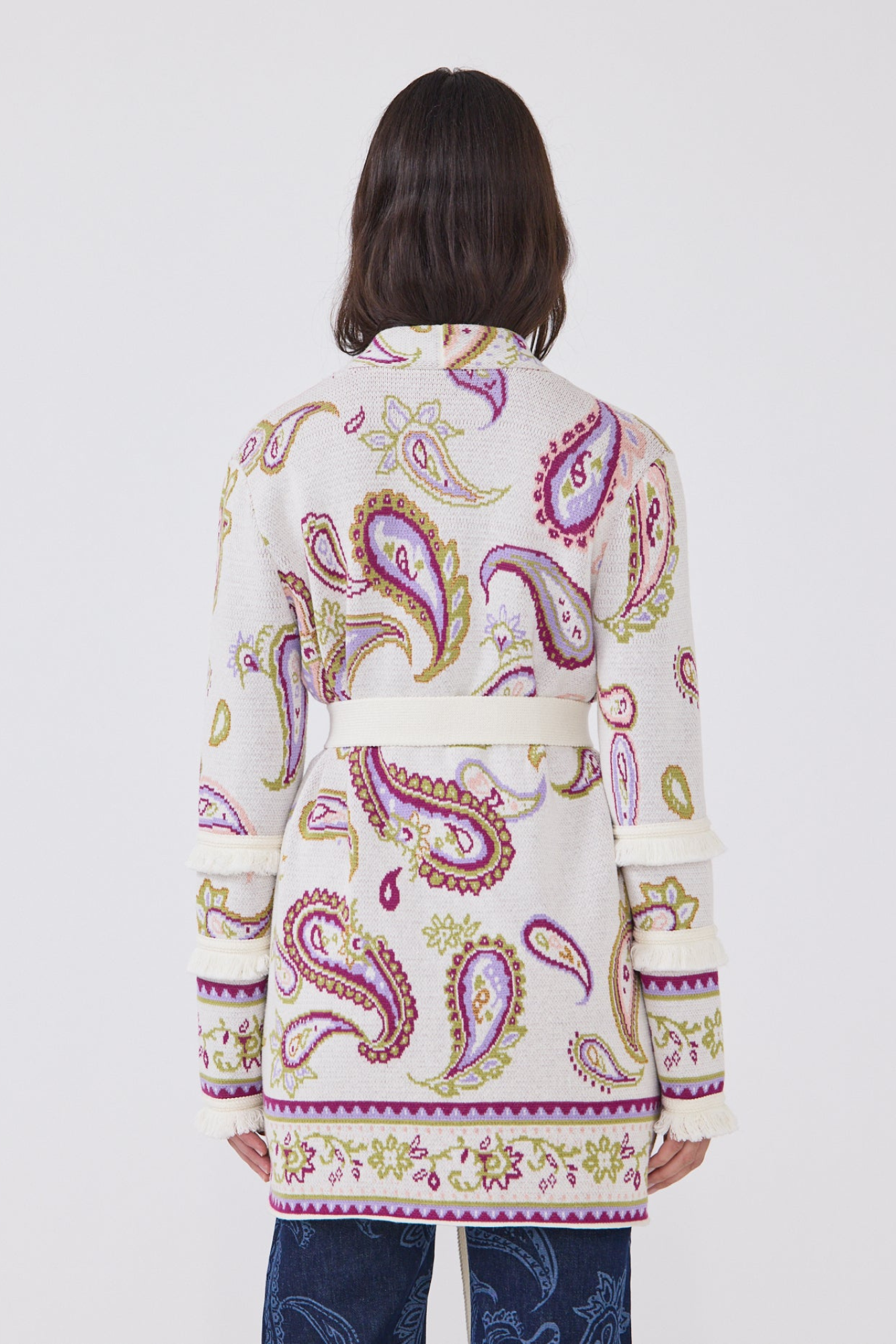 A refined bohemian layer for in-between days, this cream cotton jacquard paisley cardigan is woven with rich detail - a riff on a vintage-inspired print designed in-house. Tiered fringe sleeves add playful texture, perfect for elevating a simple linen t-shirt and jeans