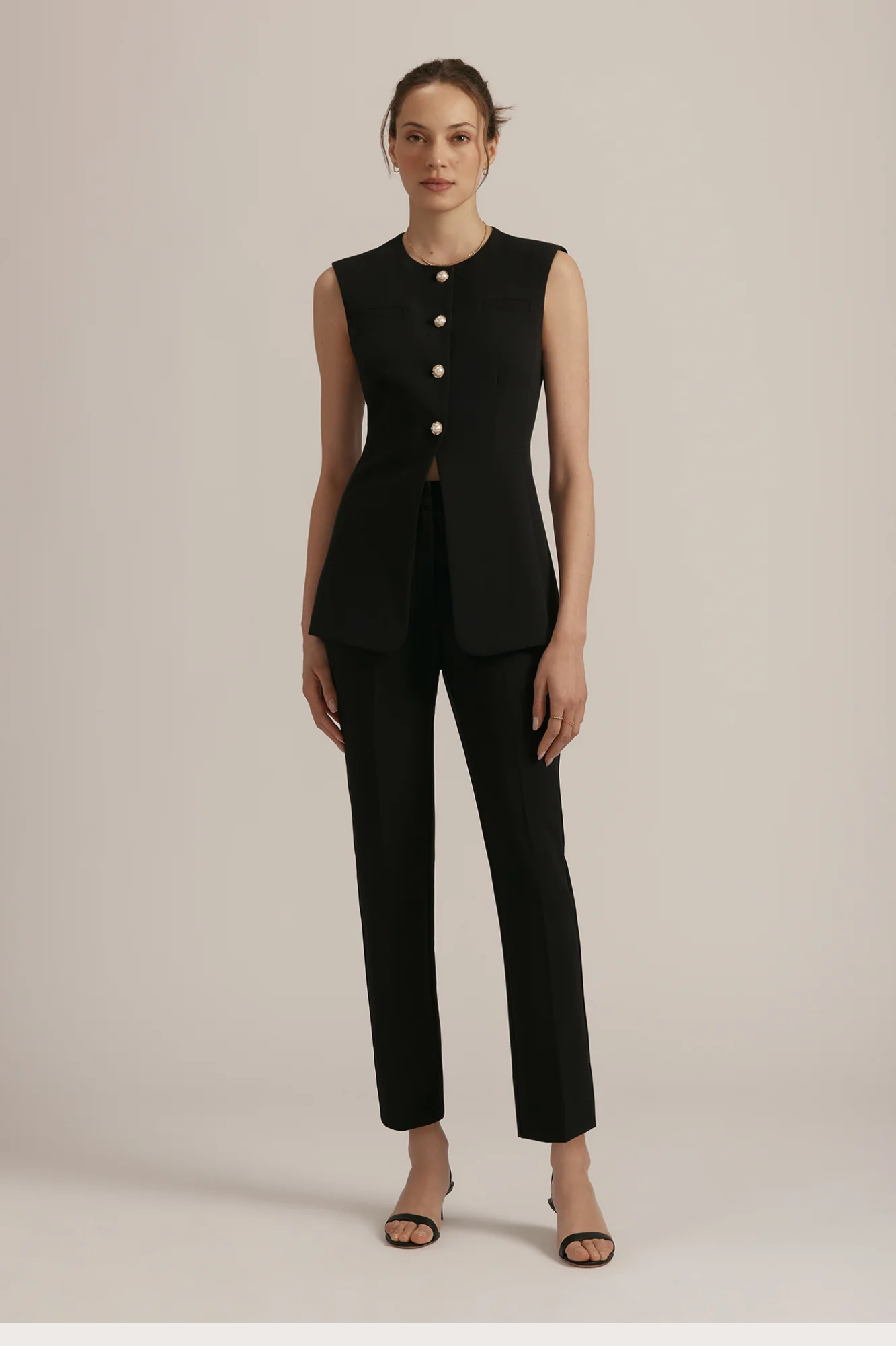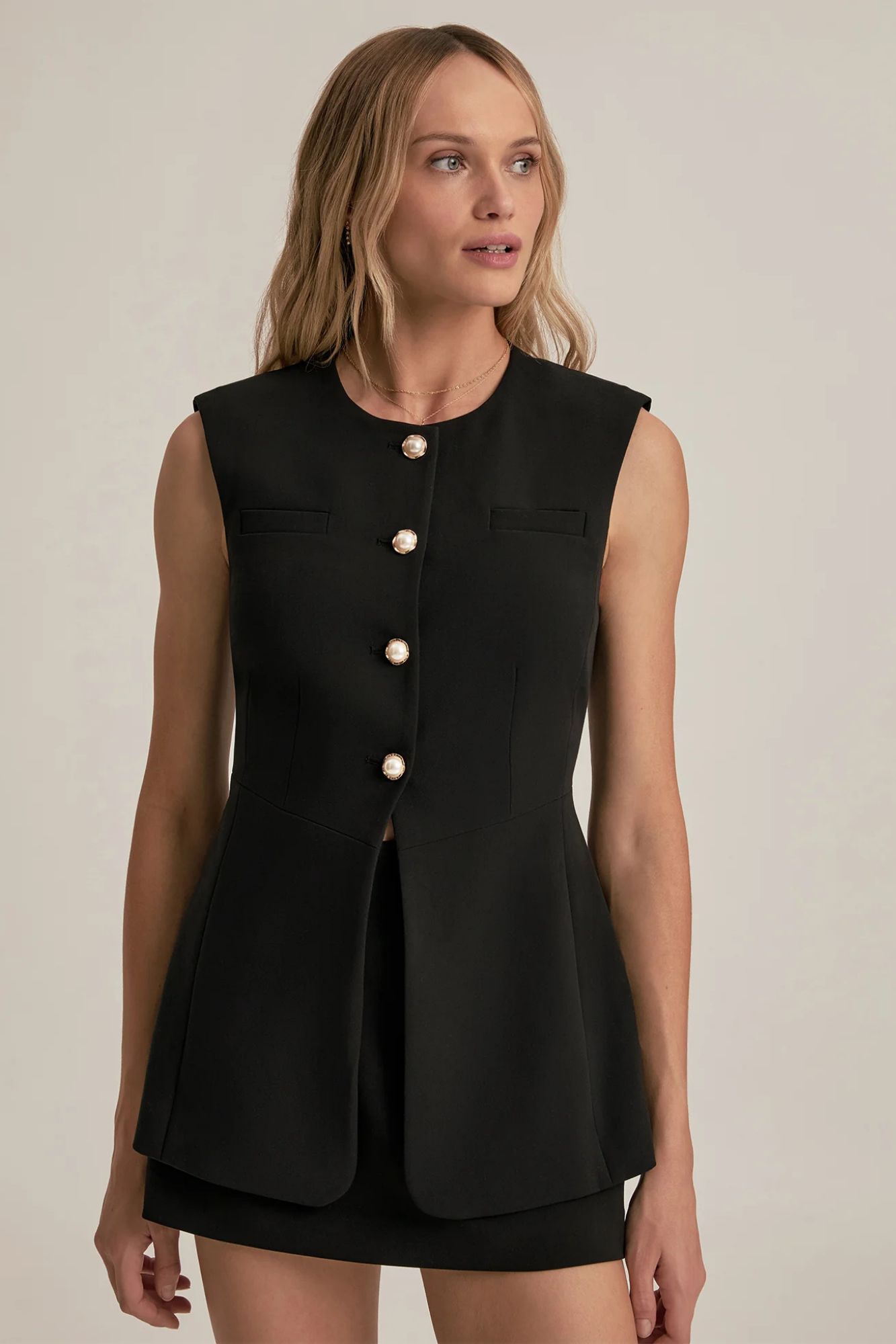 Meet your new workwear favorite. A long-line blazer with a crew neck and front button closure, featuring pearlized gold rim buttons. With a fitted waist and slight peplum shape, this sleeveless top is professional yet chic. Pair it with The Favorite Cigarette Pant when it's time to clock in and look good doing it.